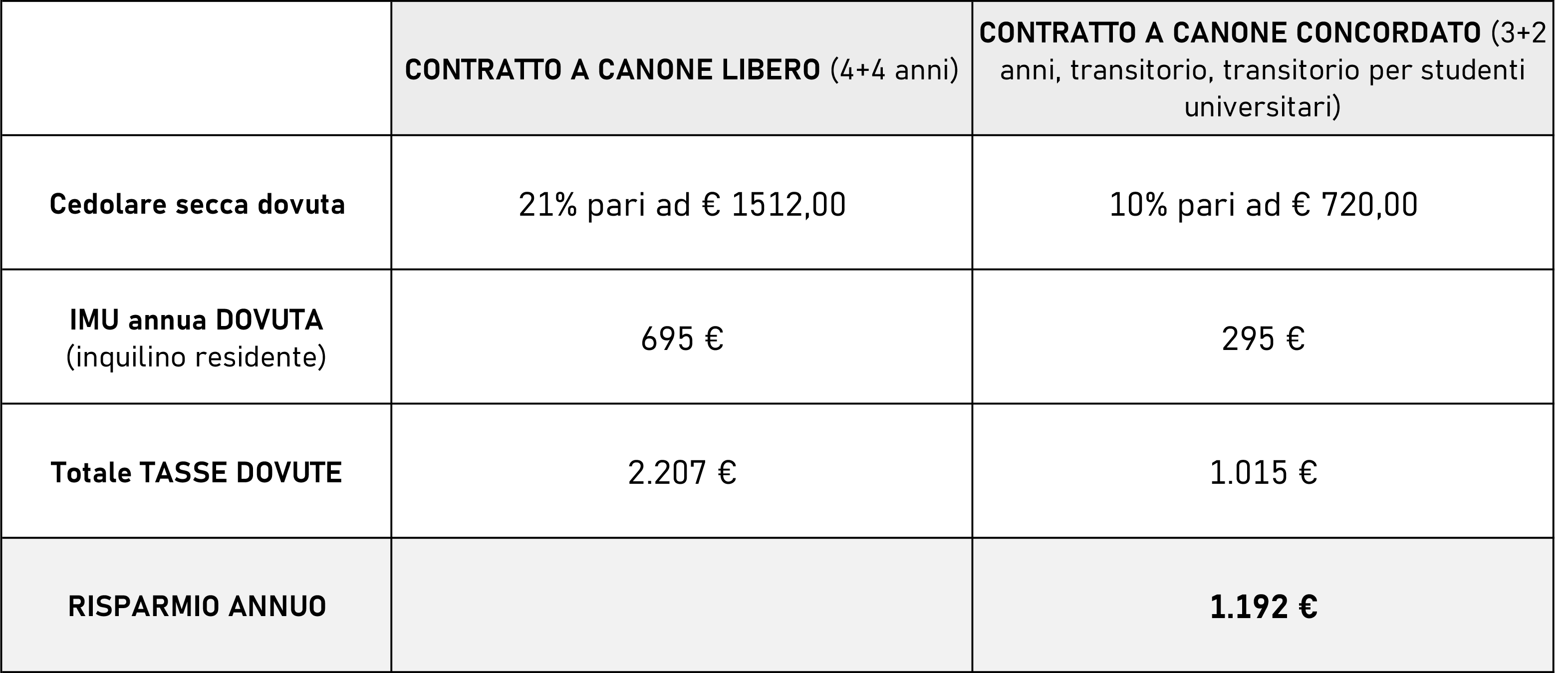 Di seguito, a titolo informativo, troverai una situazione “tipo” con la simulazione delle imposte dovute con le diverse tipologie di contratto: